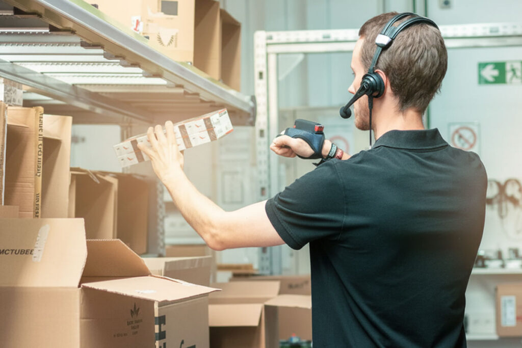 Ein Lagerarbeiter in der Industrie & Produktion, der ein Headset und einen am Handgelenk befestigten Scanner trägt, entnimmt einen Karton aus einem Regal, das von Kartons und Regalen umgeben ist.